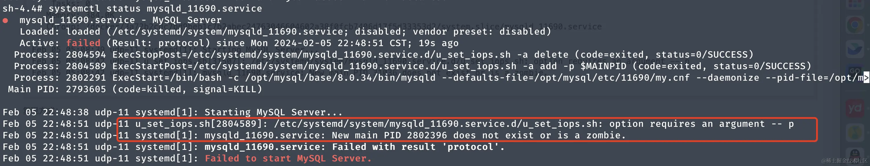 Feb 05 05:08:42 udp-11 systemd[1]: mysqld_11690.service: New main PID 31036 does not exist or is a zombie.