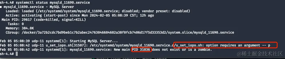 在执行 ExecStartPost 时,由于子进程 ID 31036 已经被 kill 掉,后置 shell 缺少了启动参数,但 ExecStart 步骤已完成,导致 MAIN PID 31036 成为了只存在于 systemd 里的 僵尸进程。