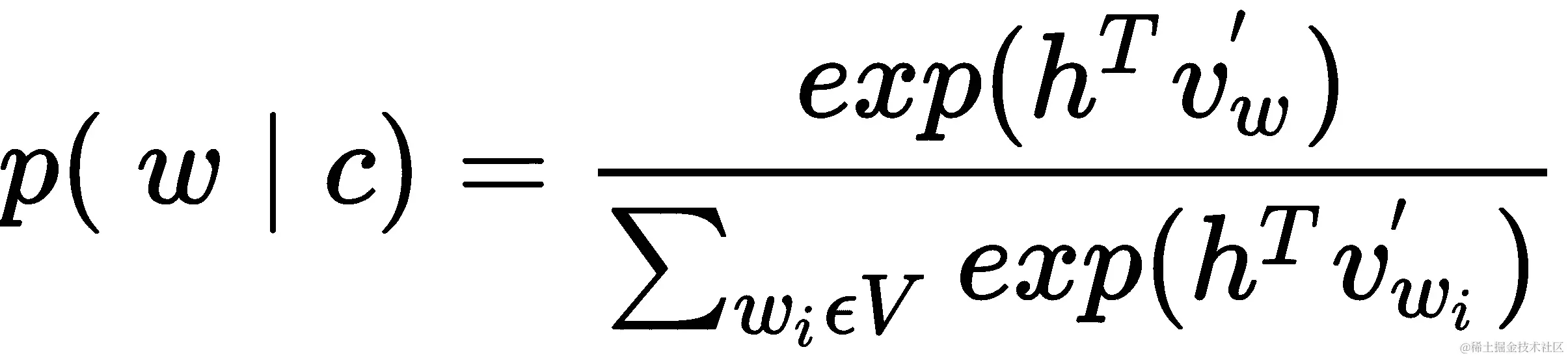 Word2vec 模型旨在预测一个单词,而这个单词可能是非常大的词汇表中的一个。神经网络通常使用 softmax 函数,该函数将任意数量的实值映射到相等数量的概率,以实现相应的多类目标,其中h指嵌入,v指输入向量,c是单词w的上下文: