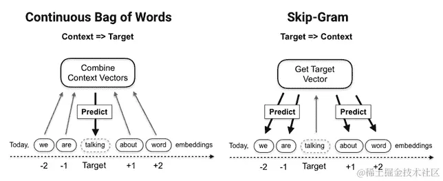 Word2vec 模型是一个将文本语料库作为输入并输出该语料库中单词的一组嵌入向量的两层神经网络。有两种不同的架构可以使用浅层神经网络有效地学习单词向量,如下图所示:
