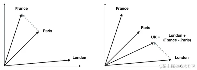 以下图显示了连接巴黎和法国的向量(即它们的嵌入之差)如何反映了首都关系。类似的关系,伦敦:英国,对应于相同的向量,即英国与通过将首都向量添加到伦敦得到的位置非常接近: