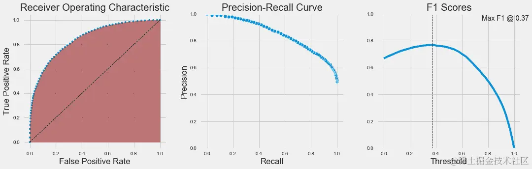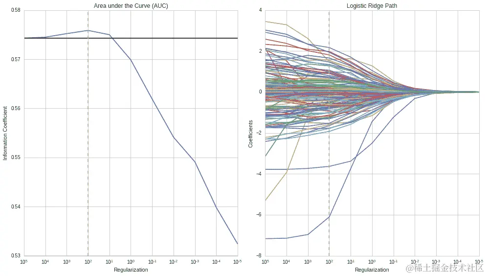 我们可以再次绘制 AUC 结果,以显示超参数值范围以及系数路径,该路径显示系数在最佳正则化值 10² 处略微收缩时预测精度的提高: