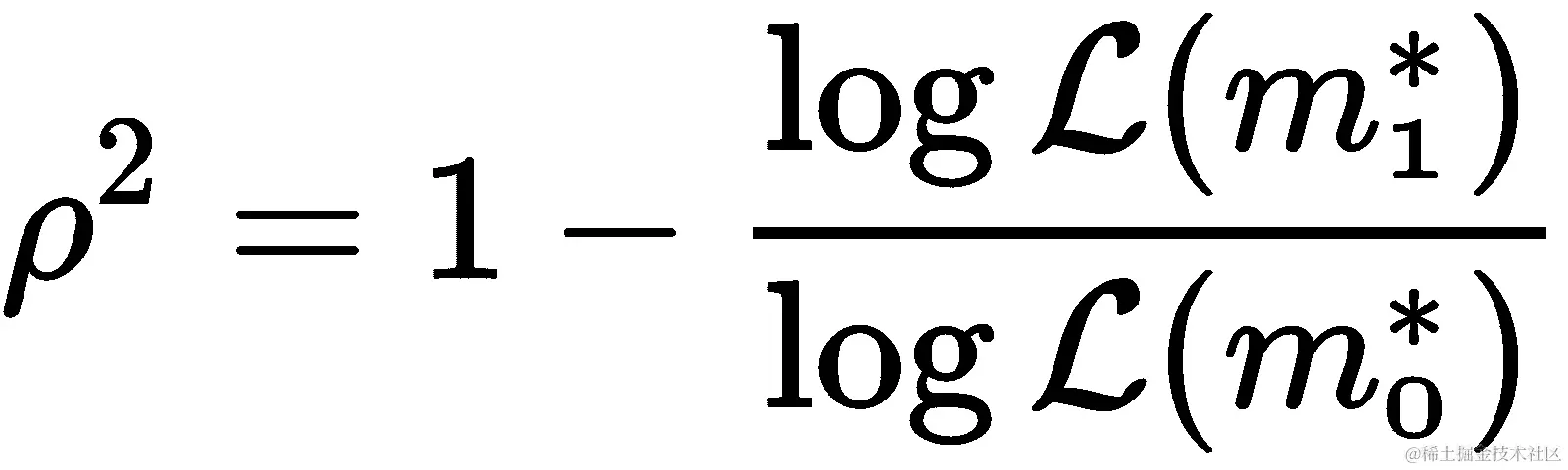 伪 R^(2 ) 统计量是最小二乘法下可用的熟悉 R² 的替代品。它是基于空模型 m[0] 和完整模型 m[1] 的最大化对数似然函数的比率计算的,如下所示:
