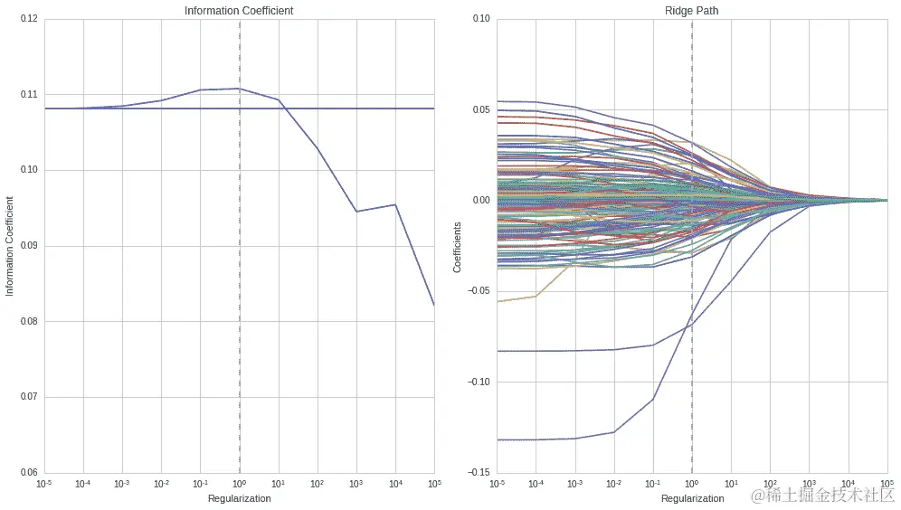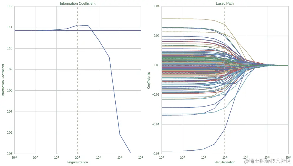 我们现在可以绘制每个超参数值获得的信息系数,并可视化随着正则化增加而系数值如何变化。 结果显示,我们在λ=10\时获得了最高的 IC 值。 对于这个正则化水平,右侧面板显示,与(几乎)不受约束的模型相比,系数已经显着收缩,λ=10^(-5):