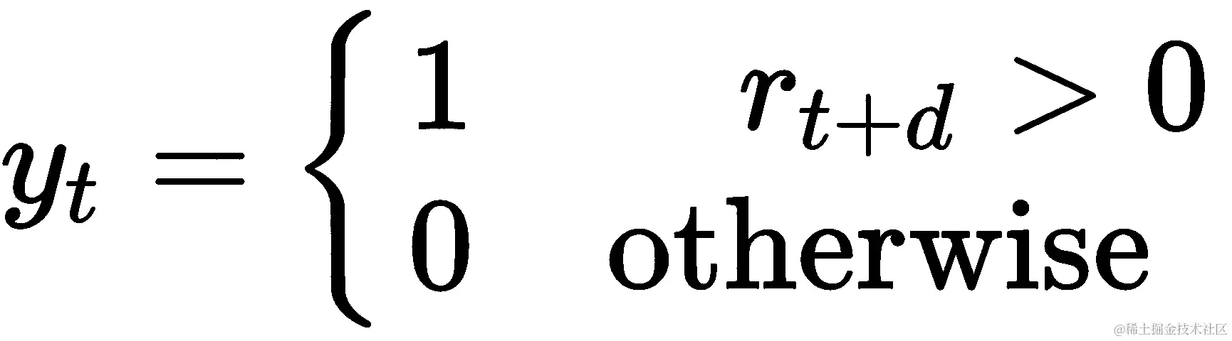 为了说明,我们将使用输出变量 y,如果在给定时间跨度 d 内股票收益为正,则取值为 1,否则为 0: