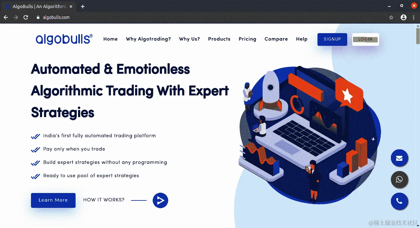 您可以通过转到官方网站algobulls.com并点击 LOGIN 登录到 AlgoBulls 平台,如下面的截图所示: