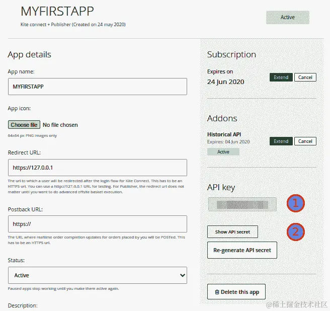 单击该应用程序以检查您的详细信息并获取 API 密钥和 API 密钥。 可选地,如果您想激活历史数据 API,请在附加组件部分单击订阅,并确认订阅。 这将花费 2,000 积分: