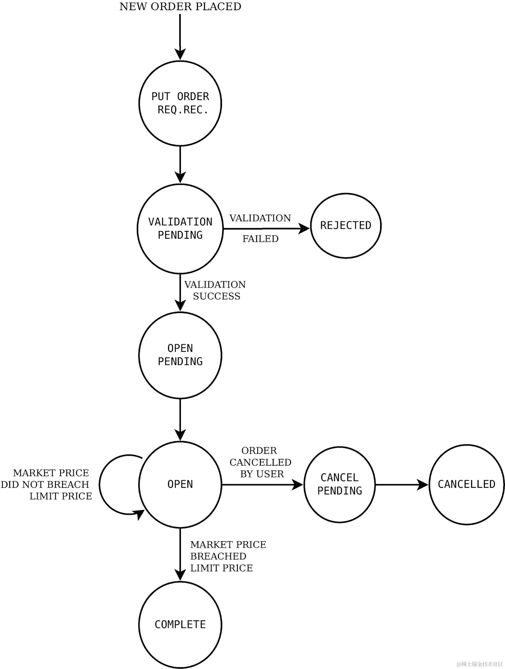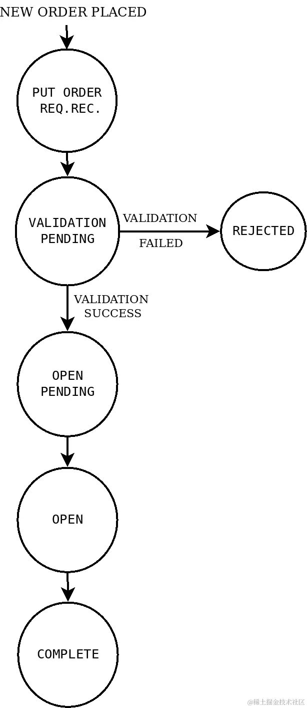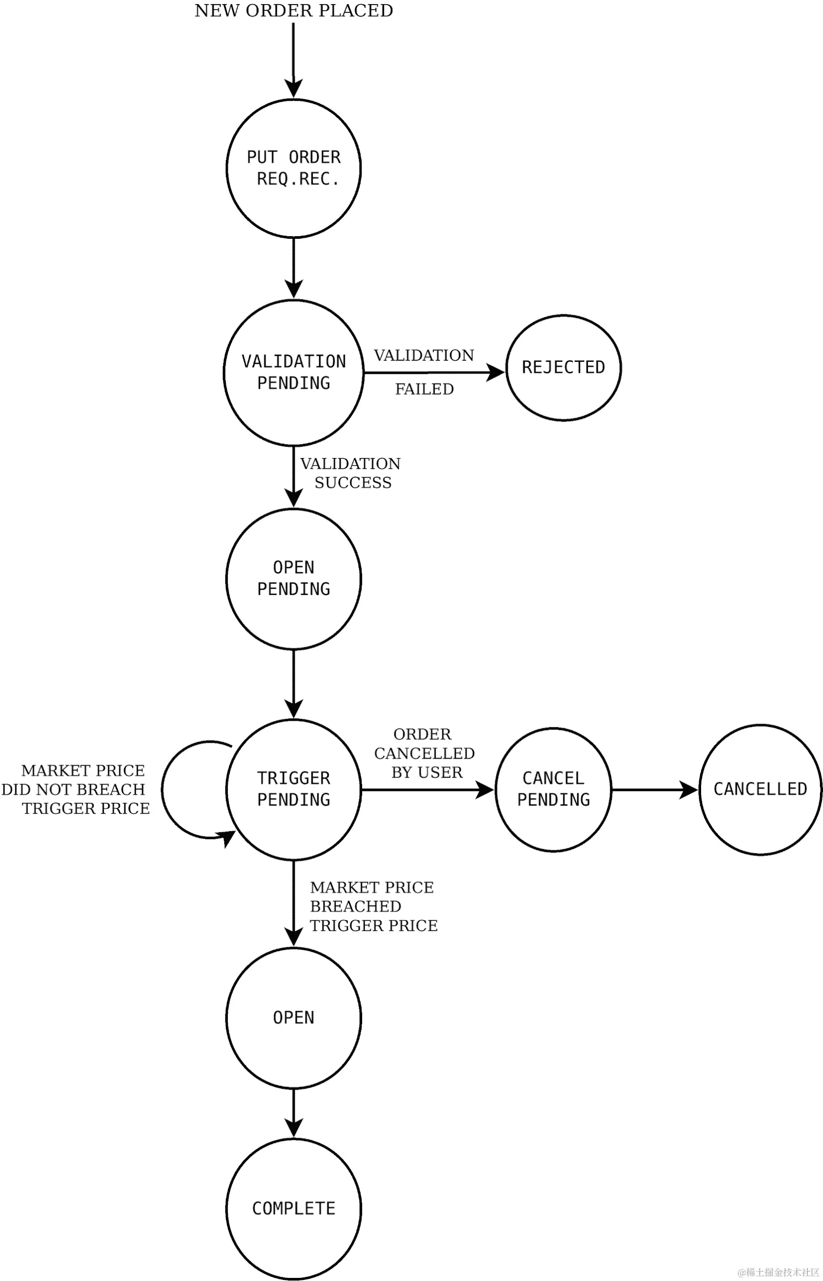在下达常规止损市价订单时,它会在最终达到终止状态(COMPLETE、CANCELLED或REJECTED)之前经历各种中间状态。一个常规止损市价订单可能会在TRIGGER_PEDNING状态下保持一段时间,直到有利的市场条件达到,然后转移到COMPLETE状态。