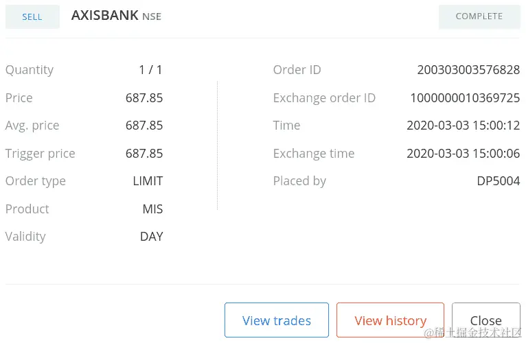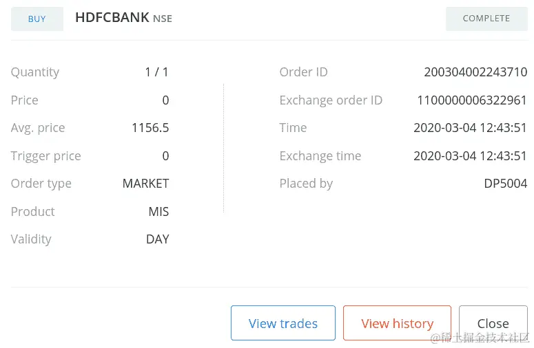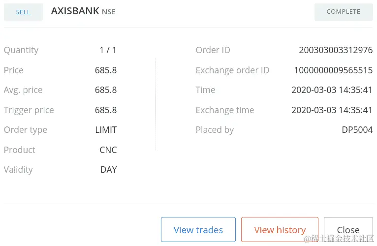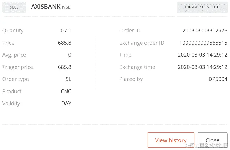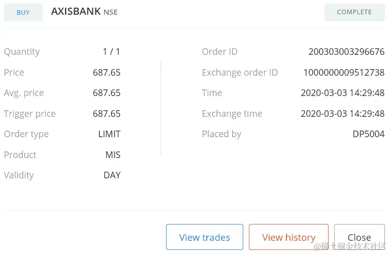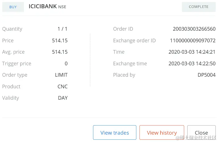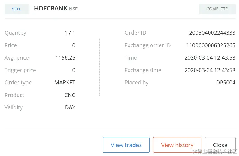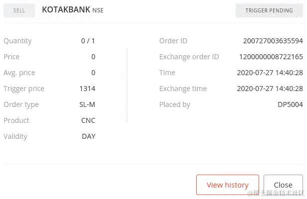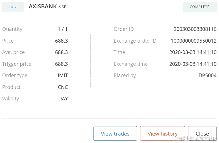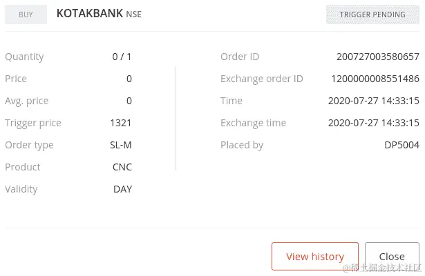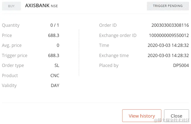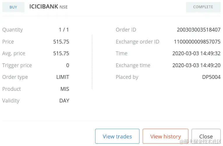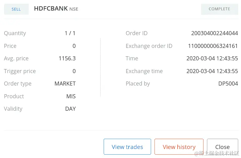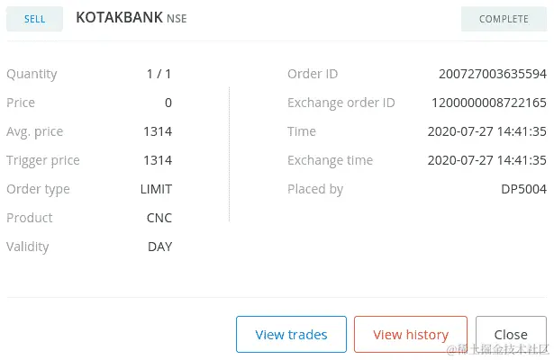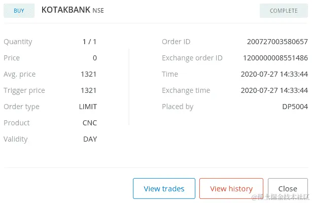 如果您使用您的凭据登录经纪人网站并转到订单部分,您可以找到您的订单详情,如下面的屏幕截图所示(您的一些数据可能不同):