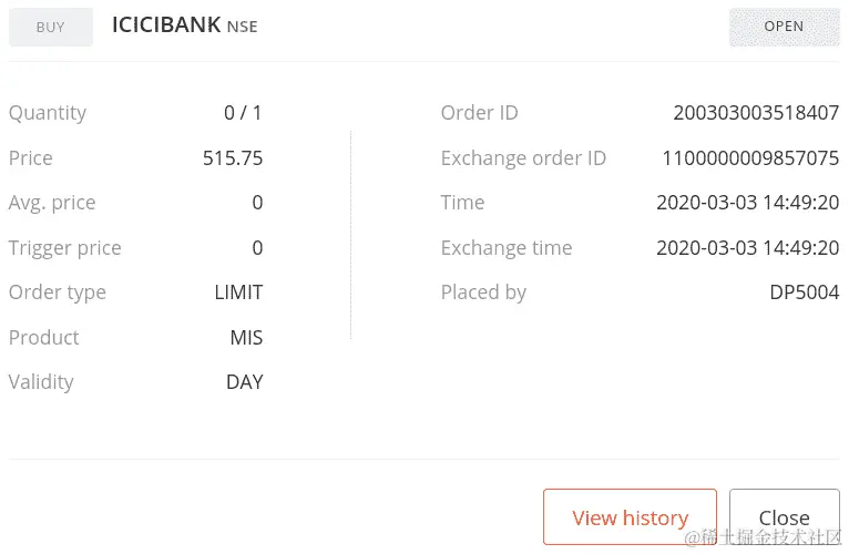 如果您使用您的凭据登录经纪人网站并转到订单部分,您可以找到您的订单详细信息,如下面的屏幕截图所示(某些数据可能对您不同):