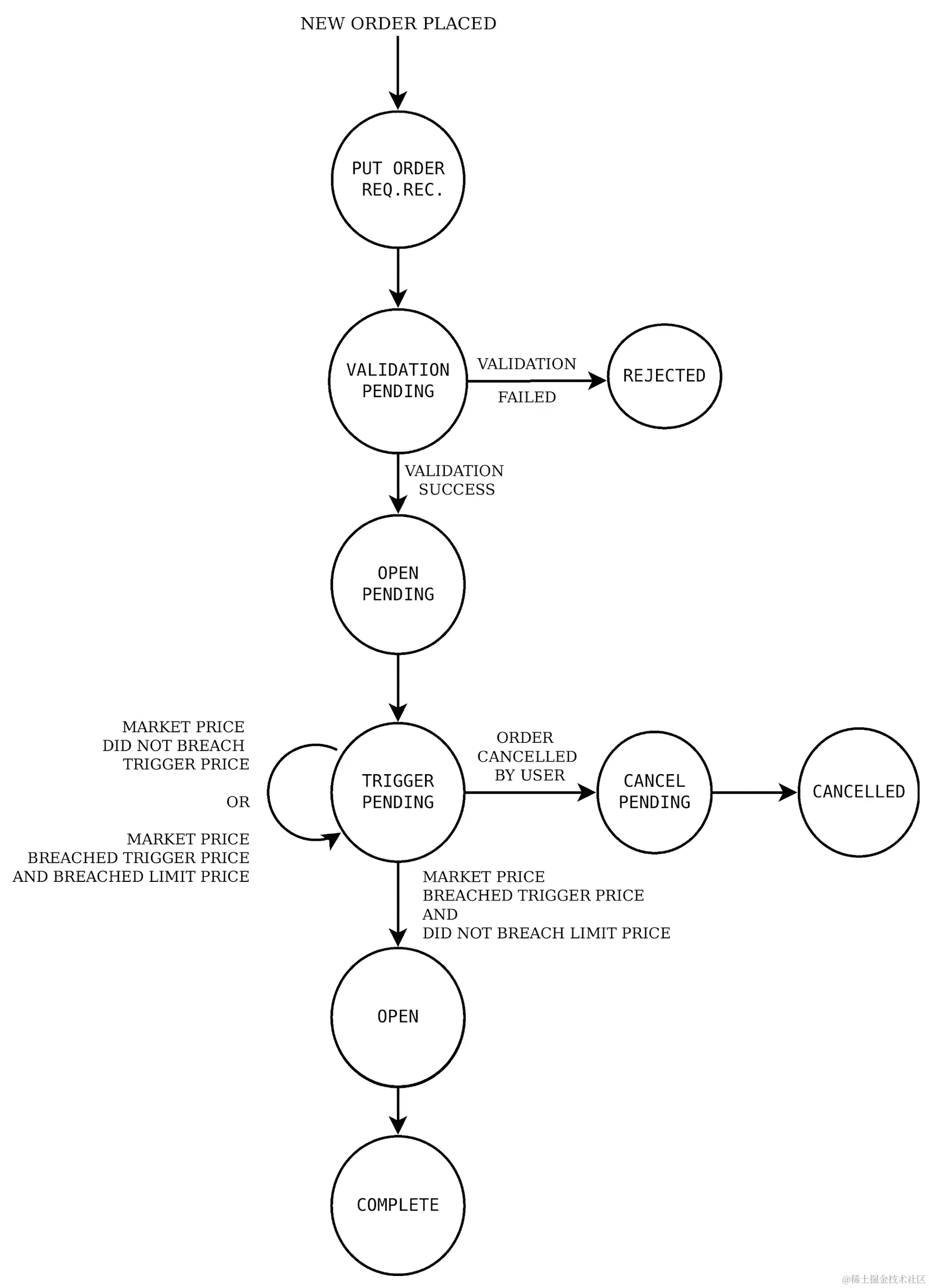 订单下达后,它将保持在TRIGGER_PENDING状态,直到市价突破触发价格。这时订单被激活并发送到交易所。订单然后以最佳可用市场价格执行。订单状态从TRIGGER_PENDING转换到OPEN再转换到COMPLETE状态。
