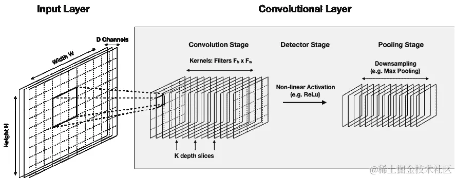 连续的计算通过卷积、探测器和池化阶段处理输入,我们在接下来的三节中描述了这些阶段。在图 18.2中描绘的例子中,卷积层接收三维输入并产生相同维度的输出。