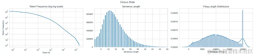 中央面板显示了约为 10 个令牌的句子长度的分布。最后,右侧面板显示了约为 20,000 的申报长度的分布,由于截断而呈现高峰: