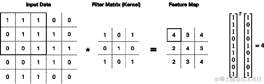 过滤器的结果,以及特征图右上角的激活是如何由扁平化的输入区域和内核的点积产生的: