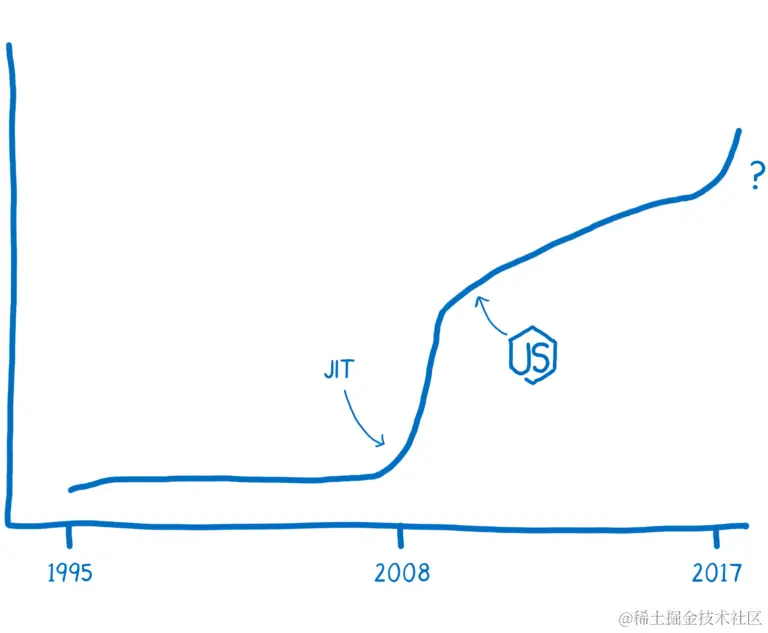 上面是 Lin Clark 介绍 JavaScript 性能历史的一张图。从2008年开始,JavaScript 性能就开始提升,且至今仍未见顶。这对于应用程序的最终用户来说是巨大的好处,因为做出来的应用程序终于不卡了,甚至可以对性能有所期待了。