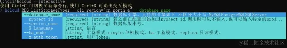 而命令交互则是支持多平台,在命令中添加“--interactive”参数即可进入交互式提示。可根据我们输入的内容,自动提示云服务名称、API名称、参数及信息描述,也提供部分参数值的补全功能。