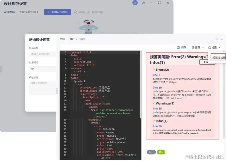 Swagger原生编辑器模式下,支持专业的API规范性检查,辅助开发者修改API设计问题;