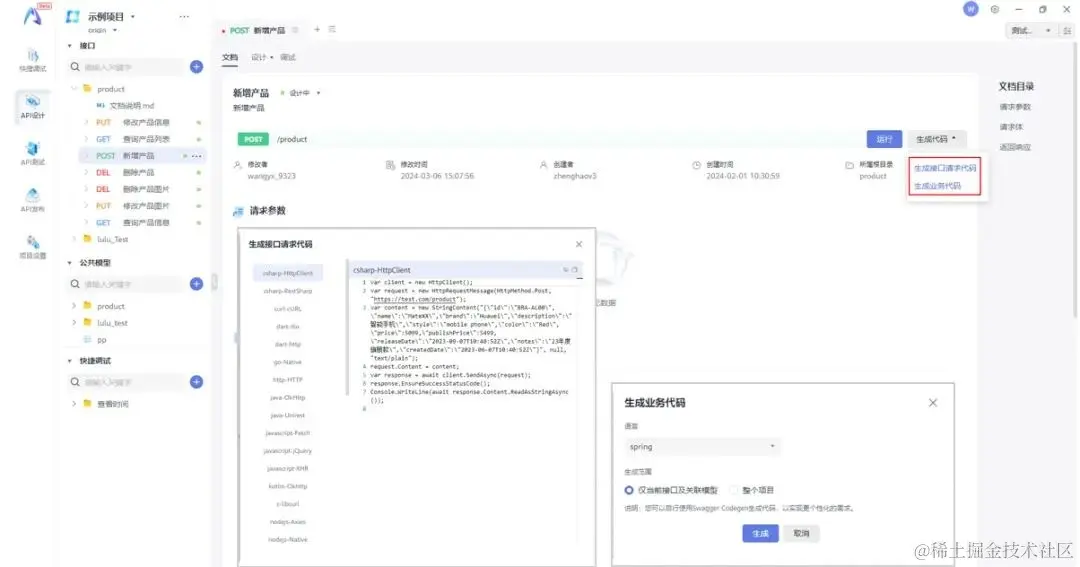 华为云CodeArts API提供根据API接口定义自动生成符合标准的代码能力,支持生成各种通用的编程语言和框架的客户端和服务端代码,生成的代码精确匹配接口设计,确保接口开发与设计一致。同时支持编辑修改和代码格式化,让前后端开发告别手动编写接口代码,缩短开发时长,也保证了代码结构的规范性。