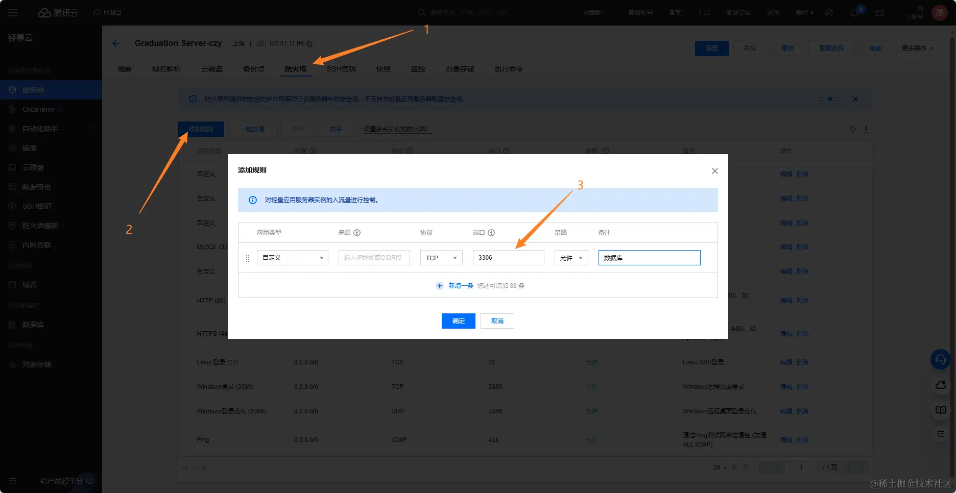 在腾讯云控制台 -> 点击防火墙 -> 点击添加规则 -> 添加端口号3306(数据库一般都是3306)