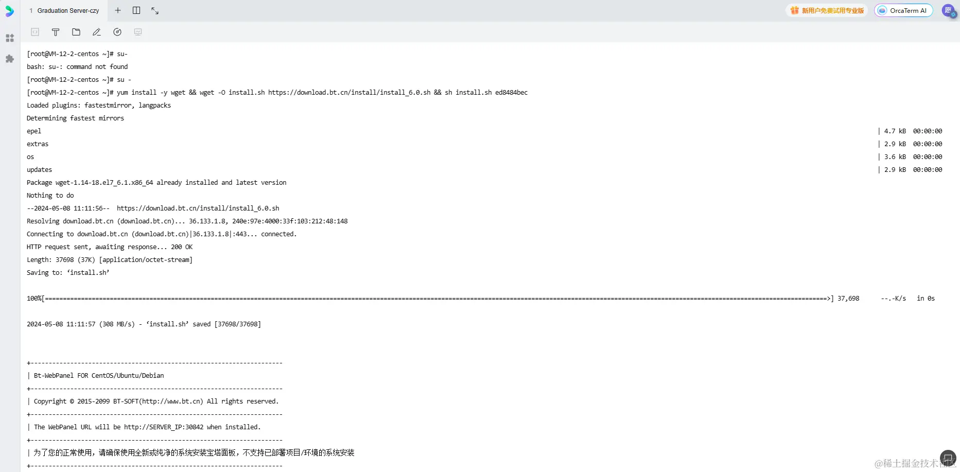 在服务器命令行输入该命令安装宝塔