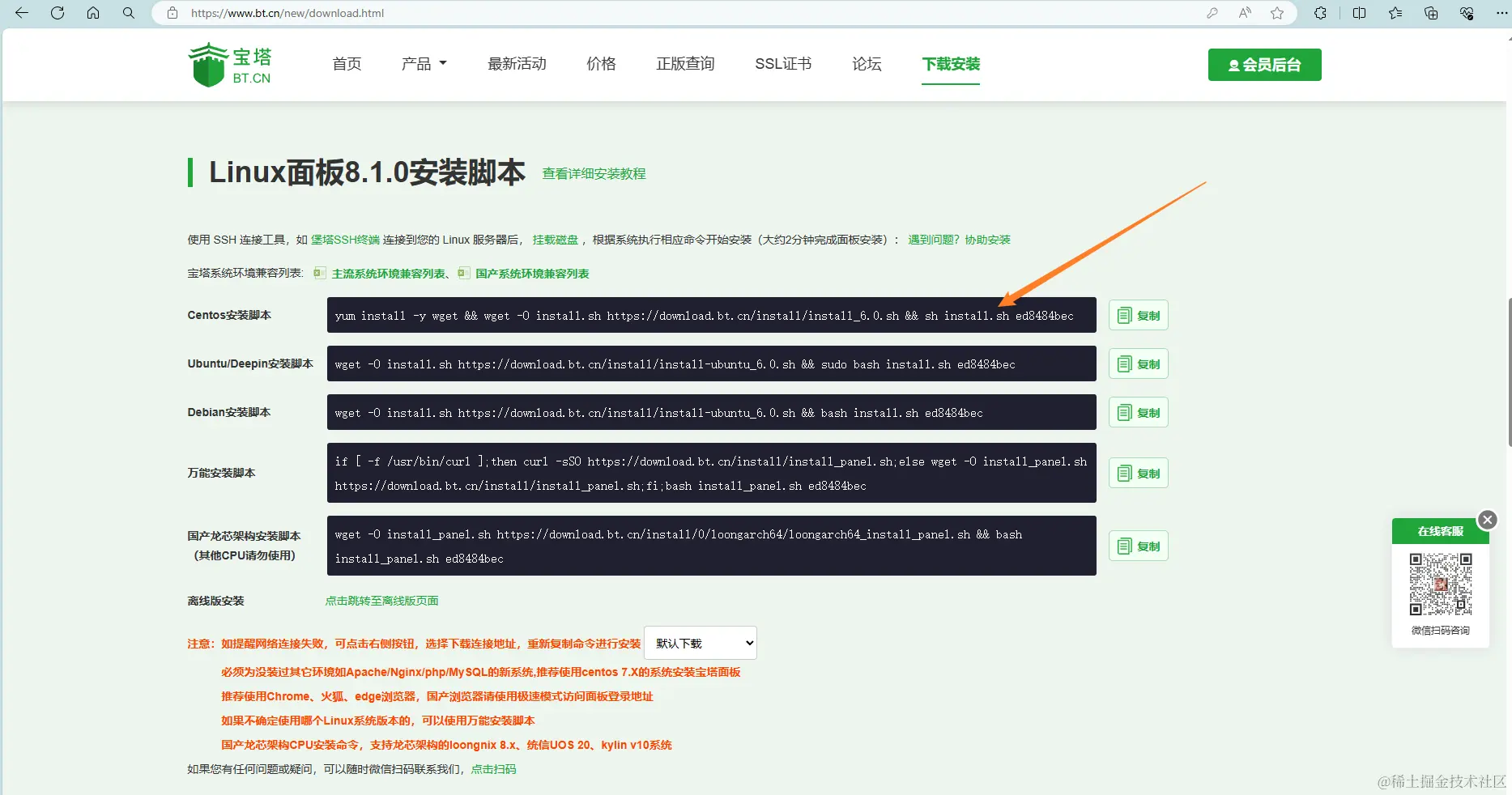 本次服务器使用的是centos操作系统,故选择相应脚本命令