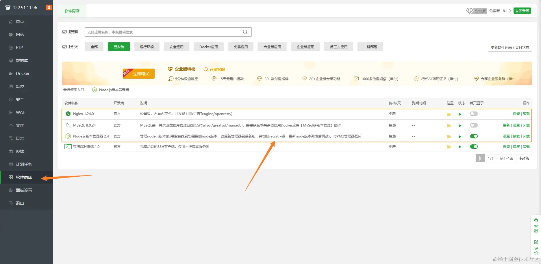 点击软件商城 -> 安装部署项目所需的mysql、nginx、node.js版本管理工具。