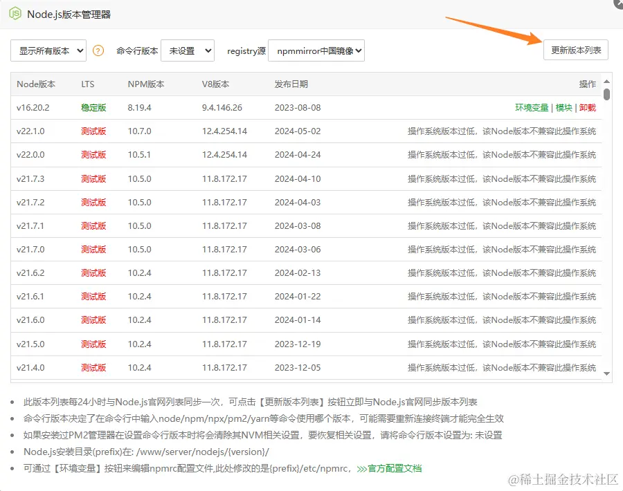 在node.js版本管理工具中选择和要部署的项目一致的node版本,特别的,可点击更新列表刷新。