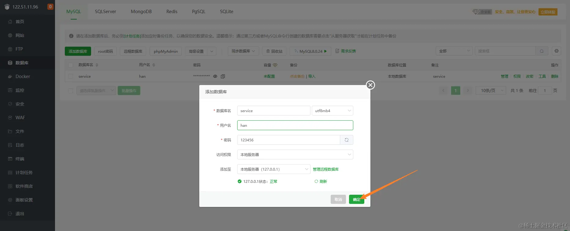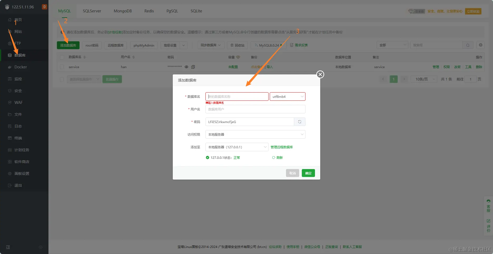点击数据库 -> 添加数据库 -> 填写数据库名、用户名、密码 -> 点击确定,创建数据库。