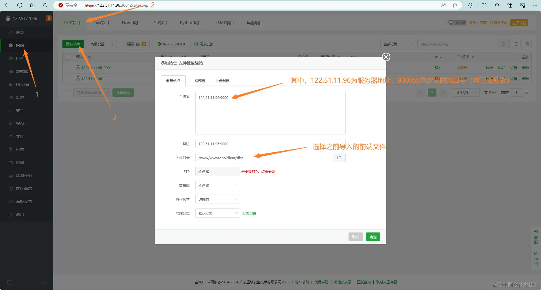 点击网站 -> 点击PHP部署 -> 点击添加站点,按照下面的图片填写信息