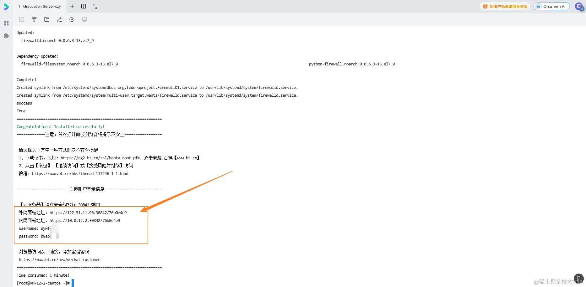 安装成功后命令行会弹出宝塔面板的登录地址、账号和密码