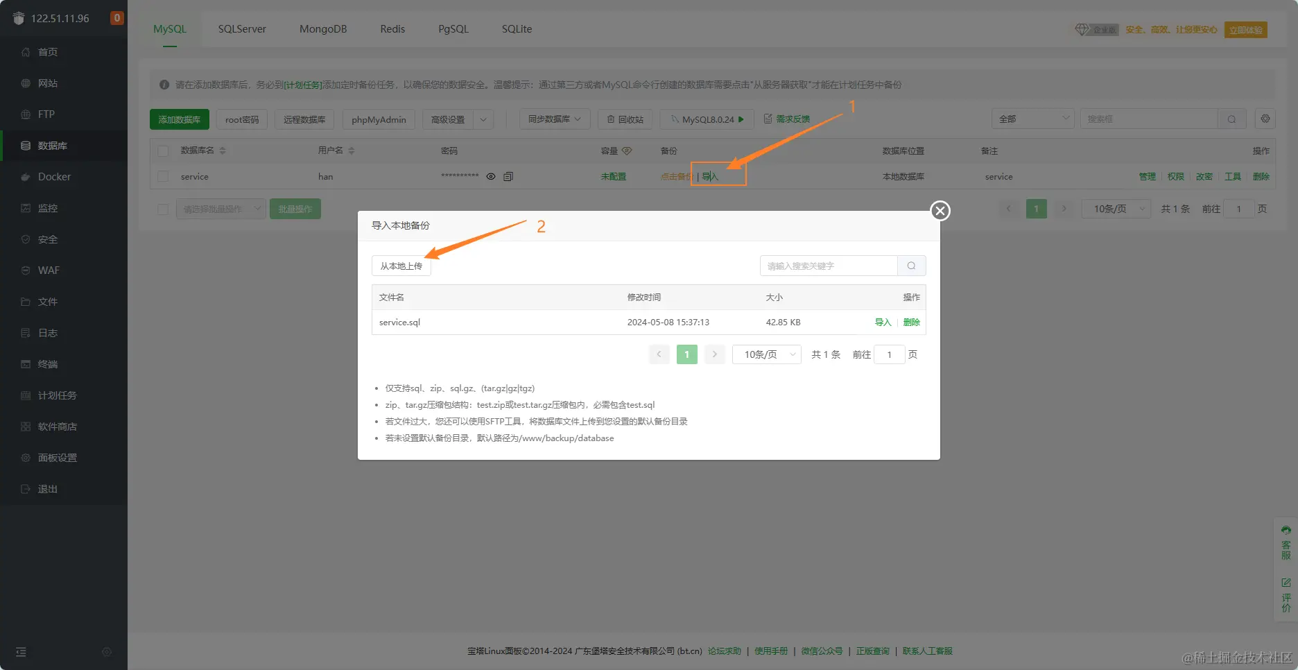 点击导入 -> 点击从本地上传,找到保存的sql文件上传。