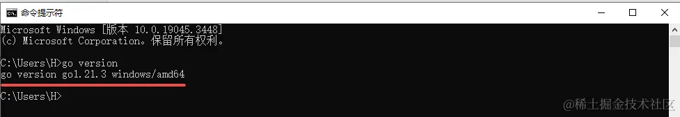 3、验证安装。在命令提示符中输入命令“go version”来验证Go语言是否安装成功,正常情况下,会显示安装的Go语言版本信息。