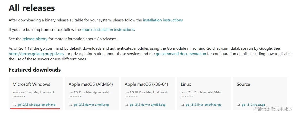 1、下载Go语言环境安装包。可以从官方网站 go.dev/dl/ 下载适用于我们操作系统的安装包,以Windows为例,可以下载go1.21.3.windows-amd64.msi安装包。