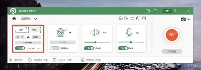 步骤2:在视频录制模式中,选择需要录制的屏幕区域(全屏、自定义),或者根据指定坐标进行录制,点击“REC”按钮即可开始录屏。
