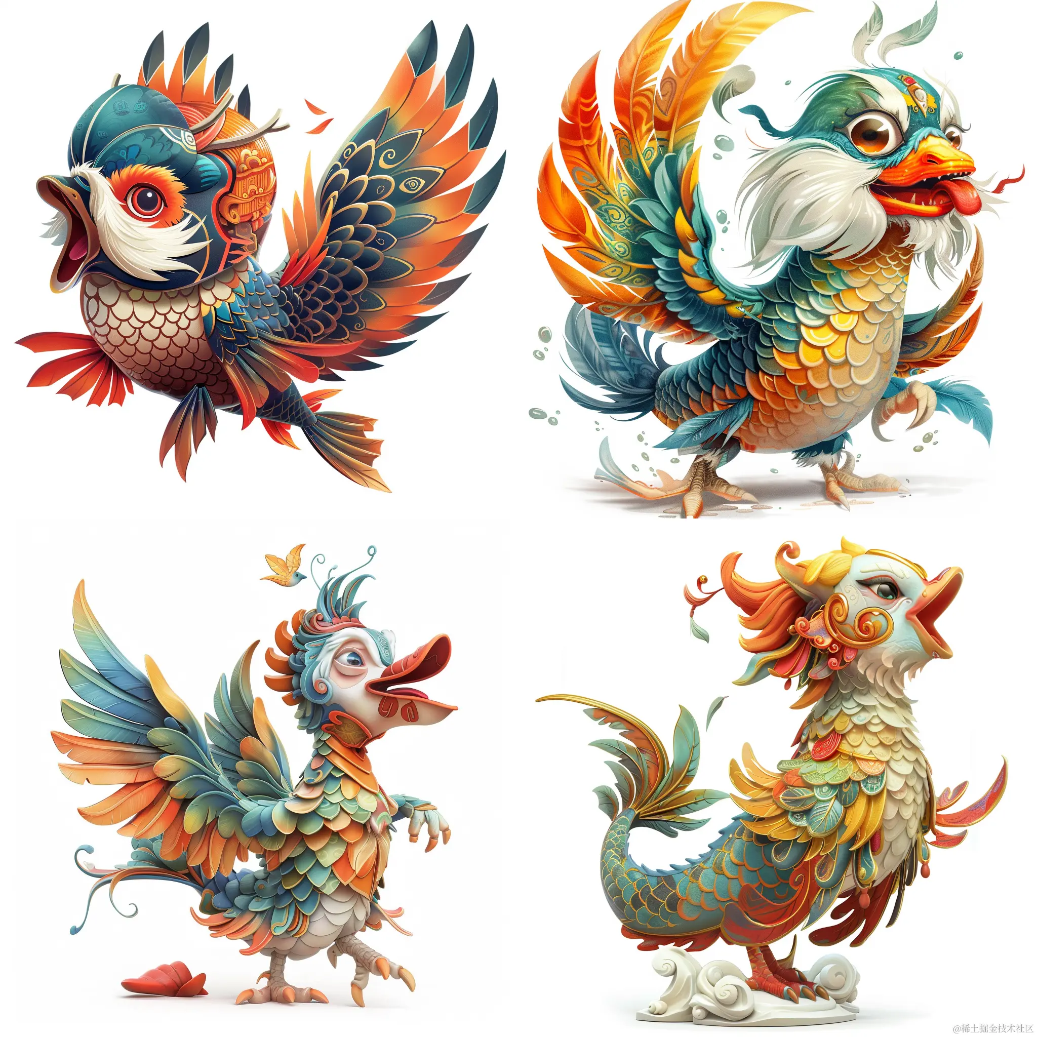 中国古代神兽,鱼身,鸟翼,鸳鸯叫声,游戏人物设计,卡通人物设计,细节生动,白底,迪士尼皮克斯风格