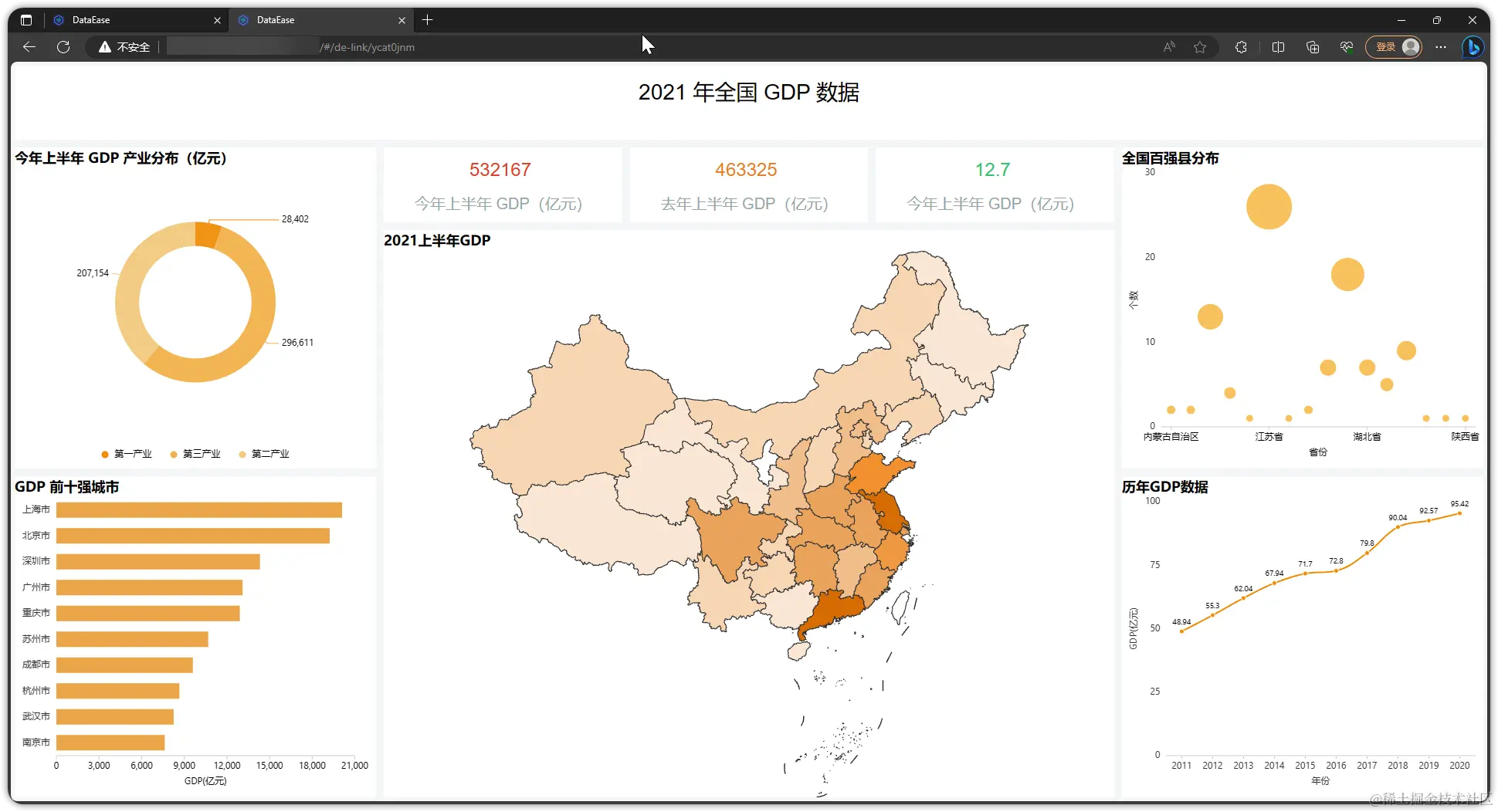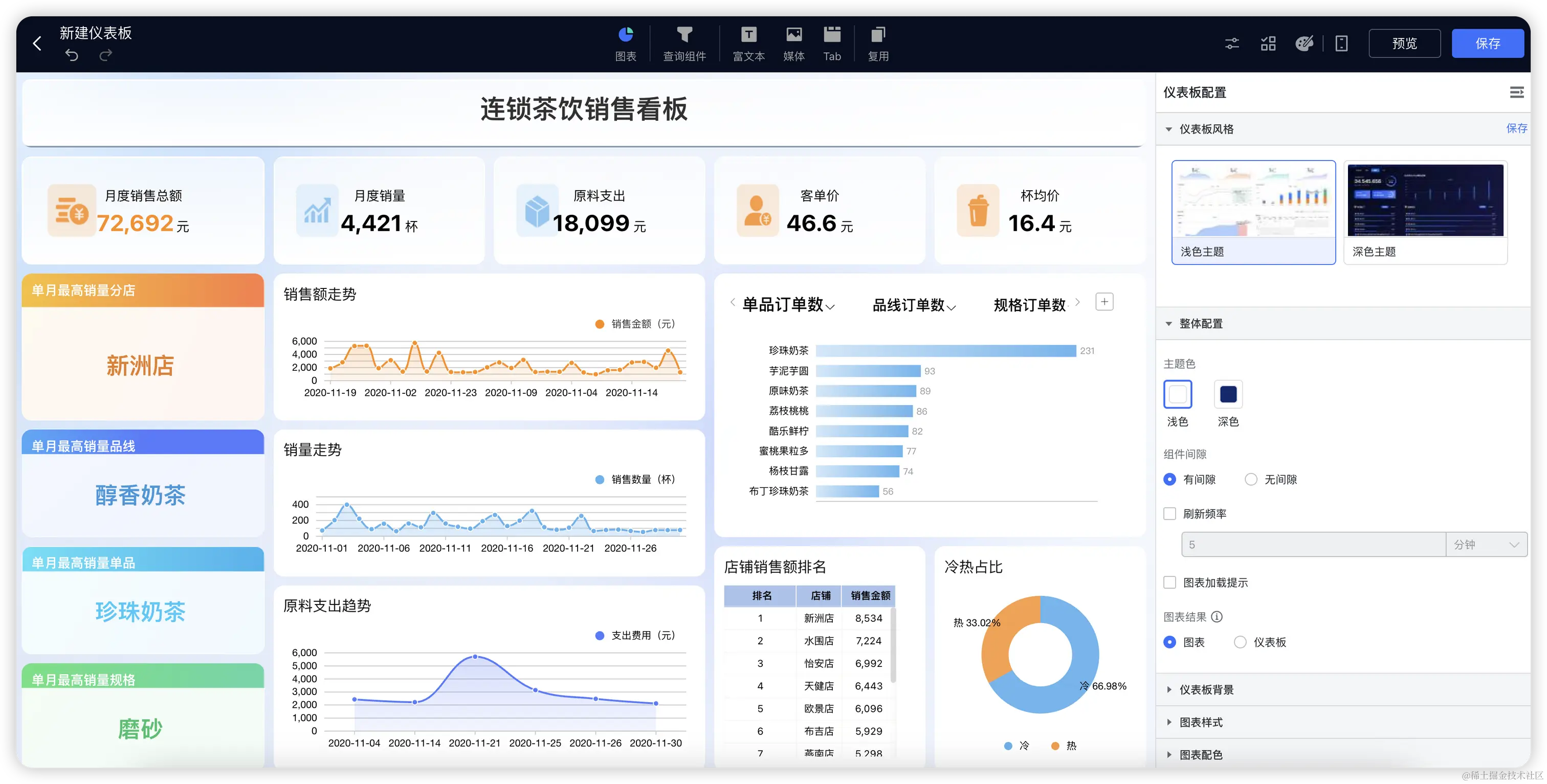- 仪表板:通过可视化效果展示具体数据常见的图形面板,倾向于快速创建及交互操作;