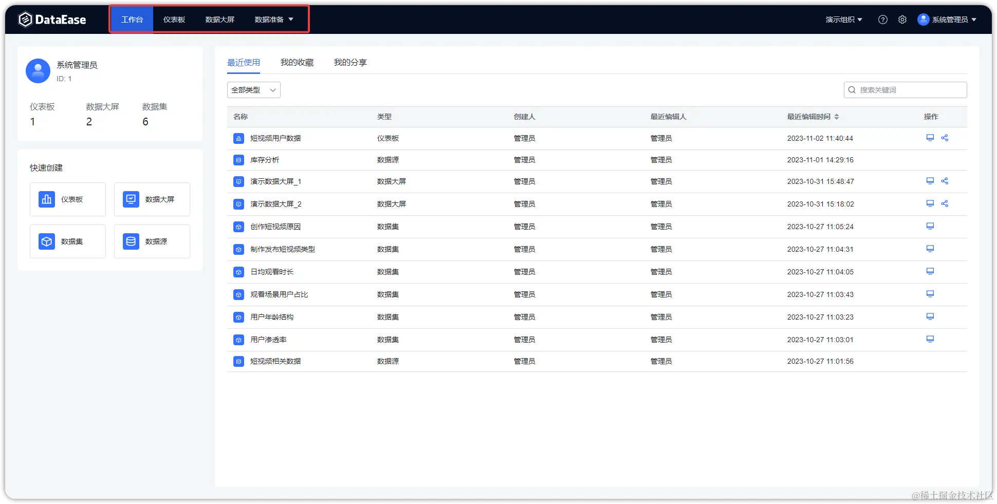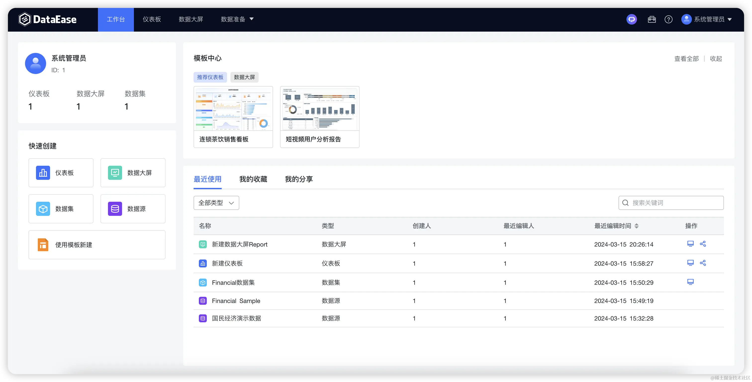 进入 DataEase 主界面后可以看到界面上方导航栏,有【工作台】【仪表板】【数据大屏】【数据准备】四大模块。