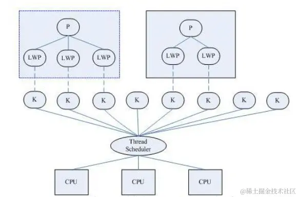 本质是内核线程与用户线程混合使用,可以使用内核提供的线程调度功能及处理器映射,并且用户线程的系统调用要通过轻量级进程来完成,大大降低整个进程被完全阻塞的风险。