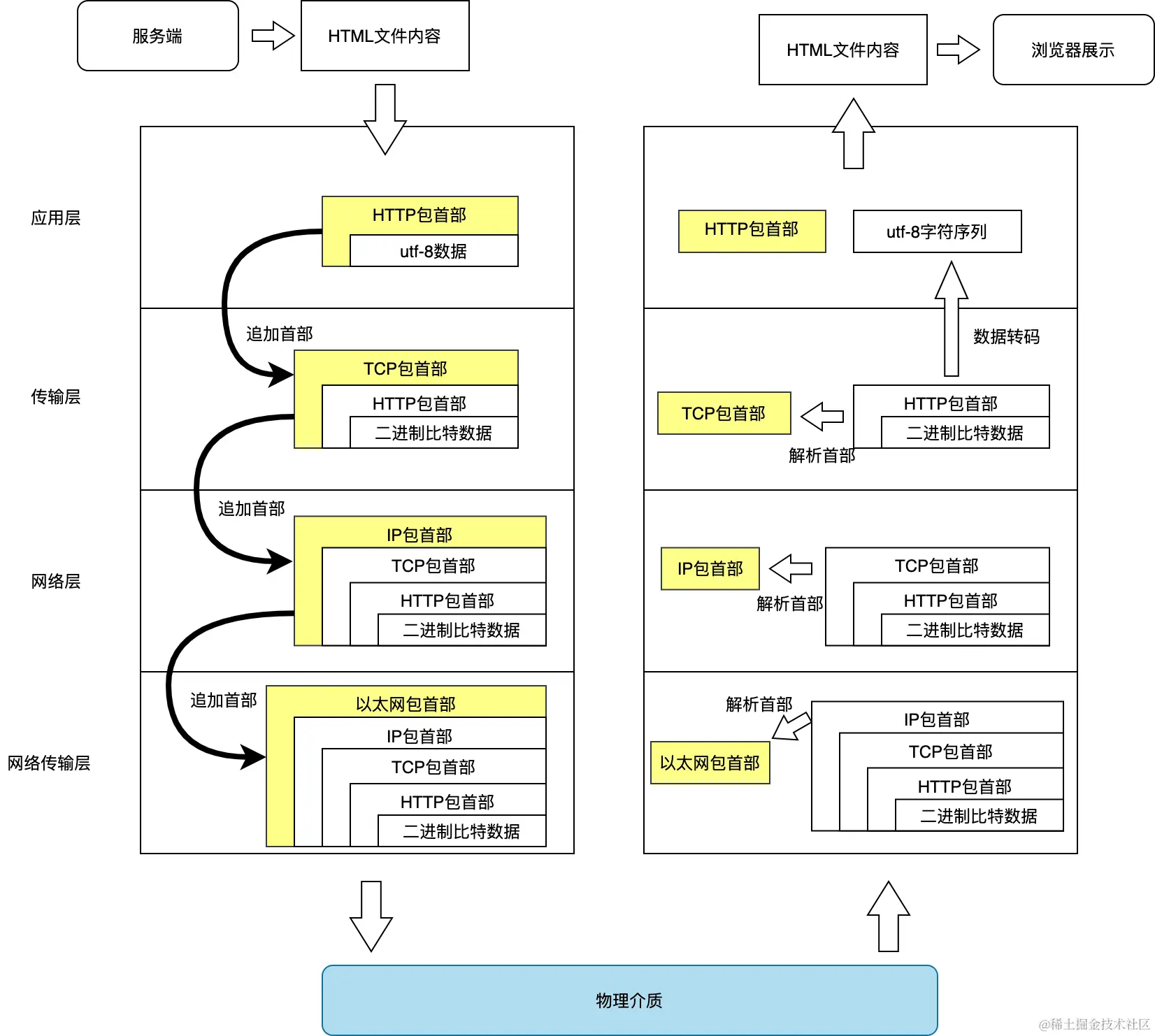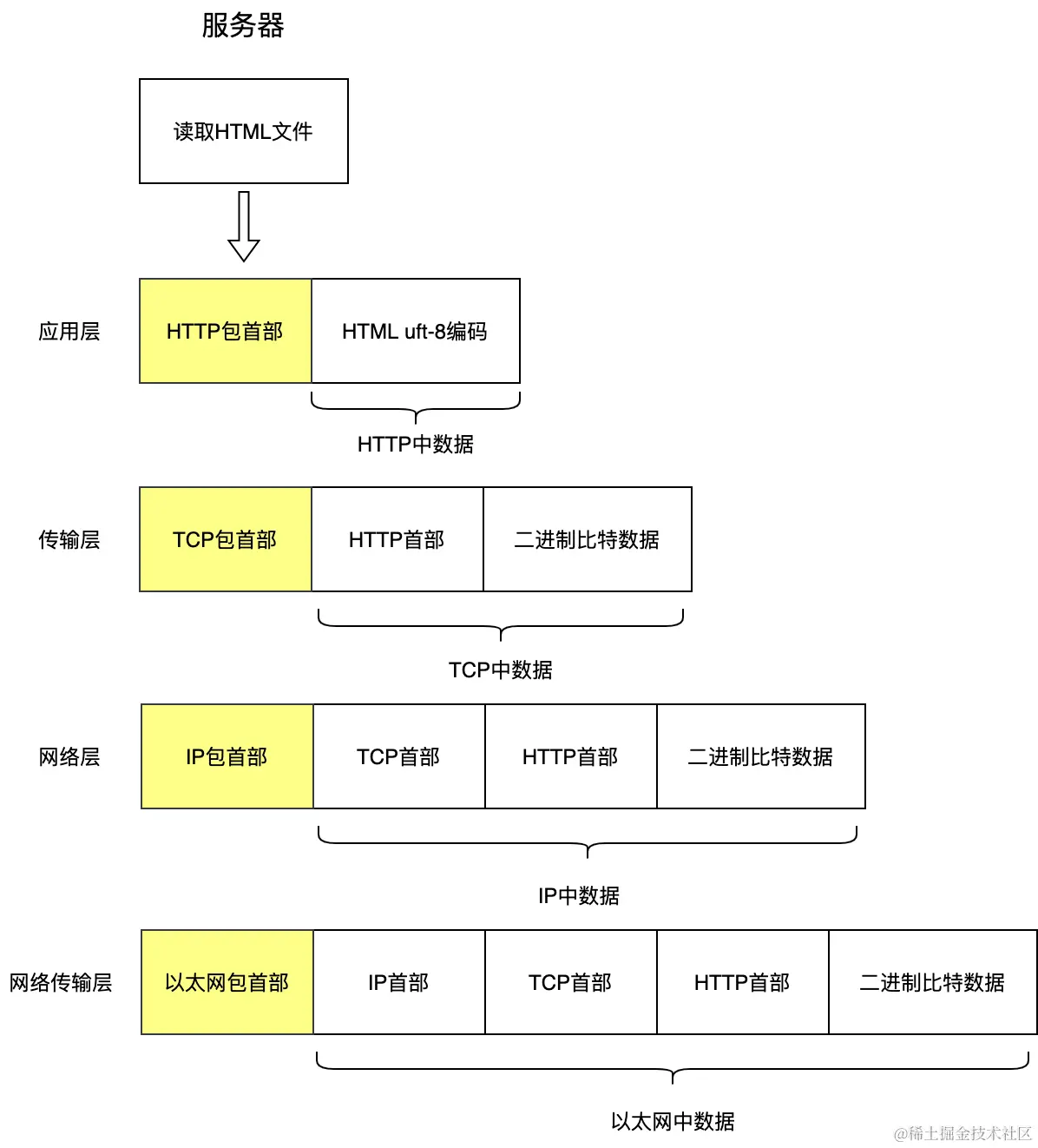 以服务端返回的HTML文件为例,包的加工过程如下: