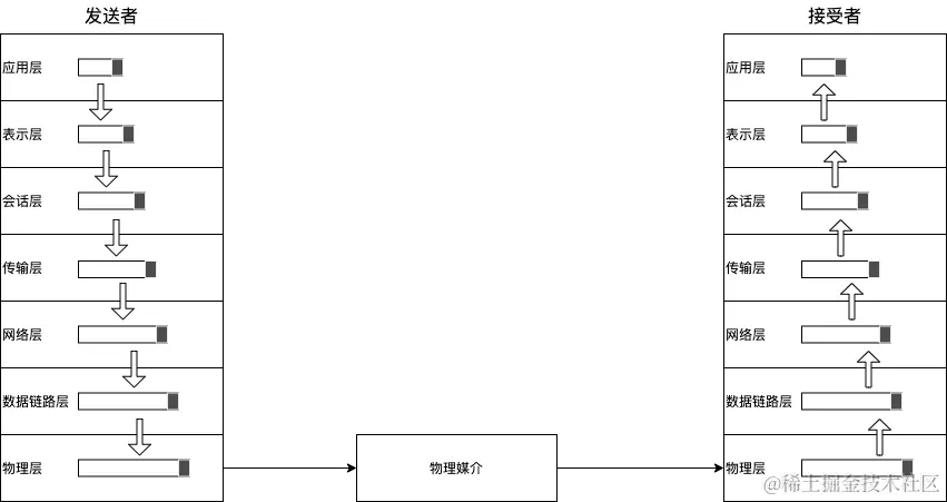 按照OSI模型,通信的双方中的发送方将数据交接给最高处,然后层层下发,下发的过程中每层会根据自己的需求对数据进行加工,直到最下层,然后通过物理链路传递到接收方,接收方会按相反的方向从最底层层层解码将数据传递到最高处,最终传递给目标应用程序。大致的流程如下: