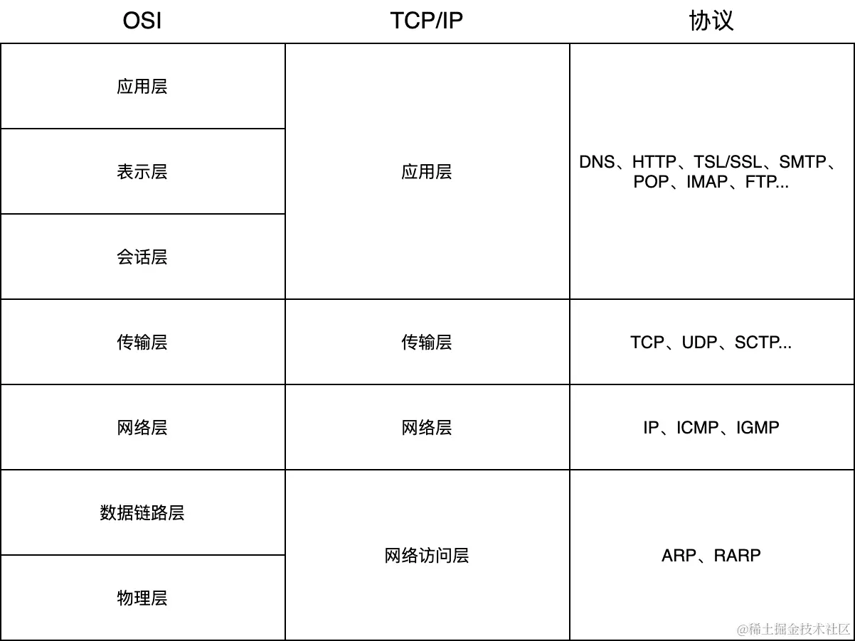 TCP/IP的应用层等于将OSI的上三层应用层、表示层、会话层合并。根据对应的协议可以看出来,在实际的实现中,TCP/IP的应用程序在实现协议的时候都会把OSI这三层的功能都实现了。