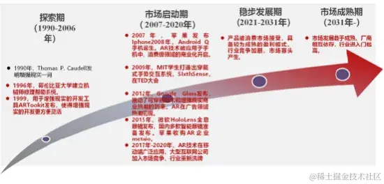 从 1990 年增强现实概念的提出,到 1999 年第一个增强现实 SDK 诞生,2000 年第一款 AR 游戏 AR-Quake 的发布,增强现实在探索期逐步发展,到了2012 年,谷歌推出AR 眼镜把增强现实带入大众视野, 让消费者开始接收增强现实概念,2015 年现象级 AR 手游《Pokémon GO》的出现将增强现实推向第一个高潮,《Pokémon GO》只用了 63 天,通过 iOS 和 Google Play 应用商店在全球就赚了 5 亿美元,成为史上赚钱速度最快的手游。同年,微软发布了 AR 头戴显示器Hololens,被誉为目前已发布的体验最好的 AR 设备。2016 年 AR 初 创公司Magic Leap 获得巨额融资,资本市场的看好给 AR 带来了新的契机。2017 年科技巨头苹果打造 AR 开发平台,苹果在 iOS 11 中带来了全新的增强现实组件ARKit,让 AR 应用的开发门槛进一步降低。随后各种中小 AR 初创企业如雨后春笋的不断涌现,按照预期 AR 将从 2031 年进入市场成熟期。