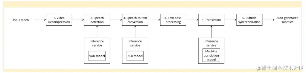 - 翻译(可选) :如果需要多语言字幕,则可以将转录的文本翻译成一种或多种目标语言,同样可以通过使用专门的机器翻译模型进行推断。