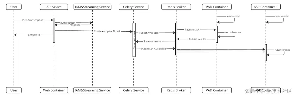 该架构的前端是 API 服务,它使用强大的 Django 框架。这是用户交互的主要界面,并处理对各种服务的传入请求,包括 转录 和内容审核服务,如 裸露检测。此层验证并解析传入请求,触发工作流中后续任务的级联,如上图最左侧所示,用户向 API 服务发起转录请求。