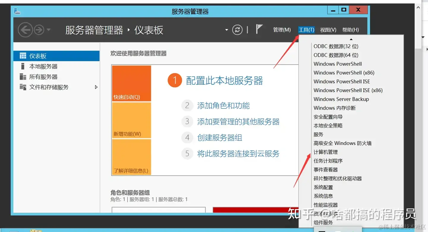 点开服务器管理器后,点击“工具”打开“计算机管理”