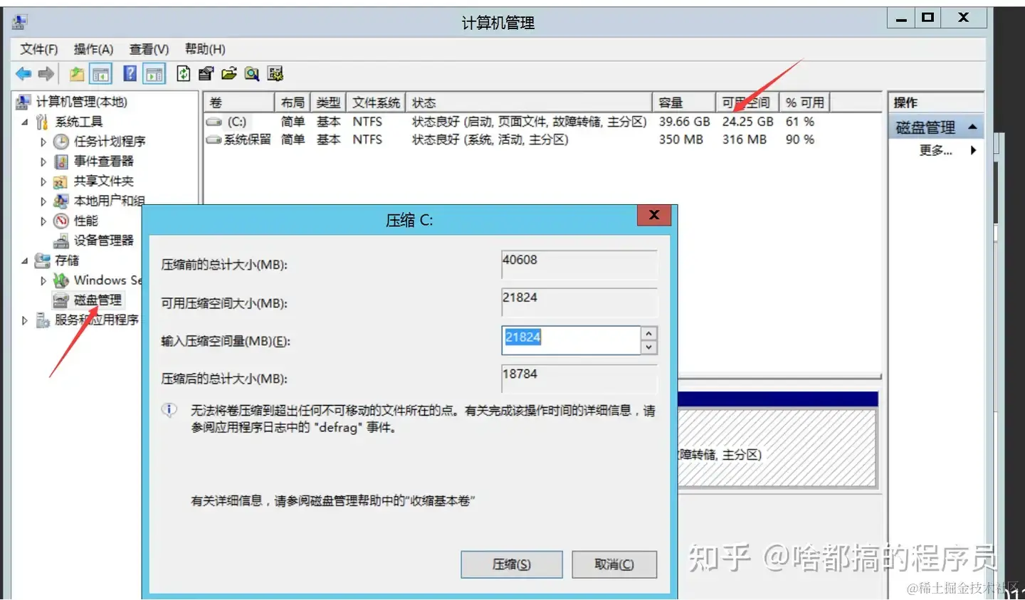 注意: 如果你的盘有未分配的分区了,就不要压缩C盘了, 我的是没有才压缩的