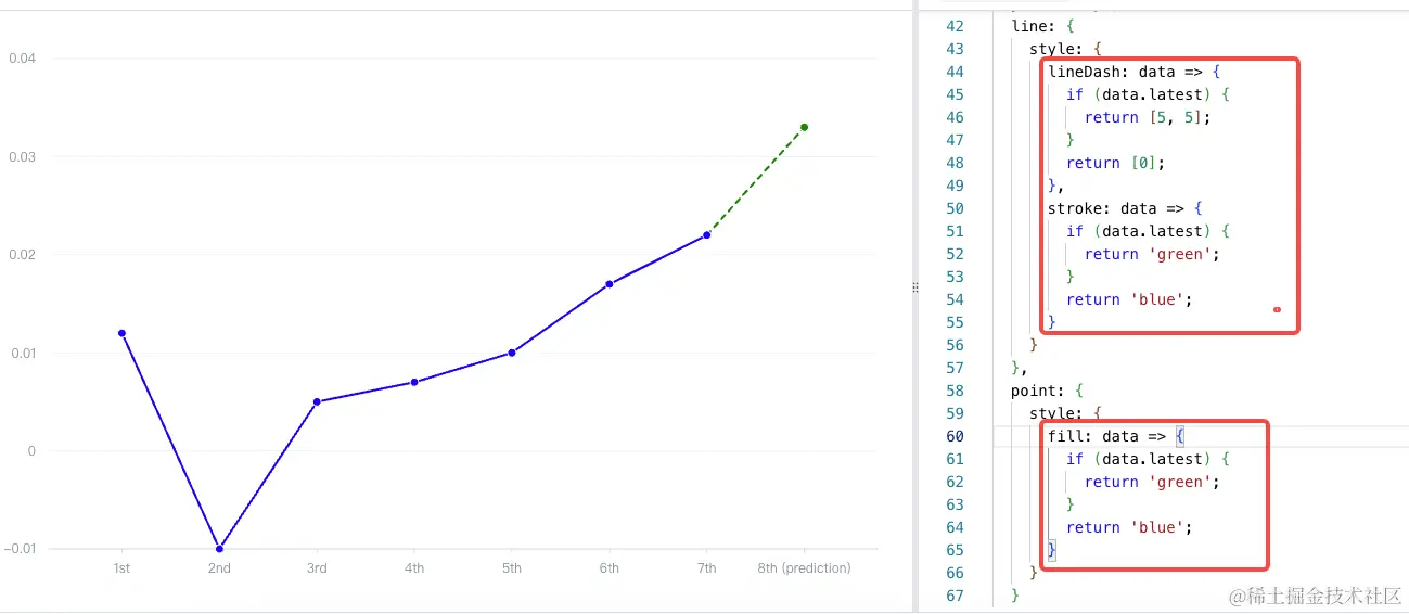 VChart 的线可以通过函数给一根线上的不同数据返回不同的样式。当出现样式不一致的情况,我们会在绘图时,将上一个数据到当前数据的线段绘制为当前数据对应的样式