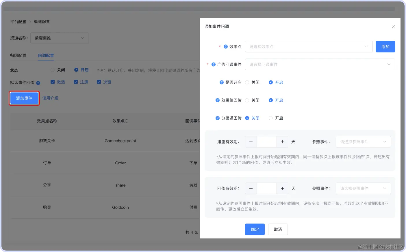 - 广告主首先可以通过openinstall渠道配置功能设置数据回传策略,包括分渠道回传、效果值回传、排重有效期、回传有效期、参照事件等自定义策略。
