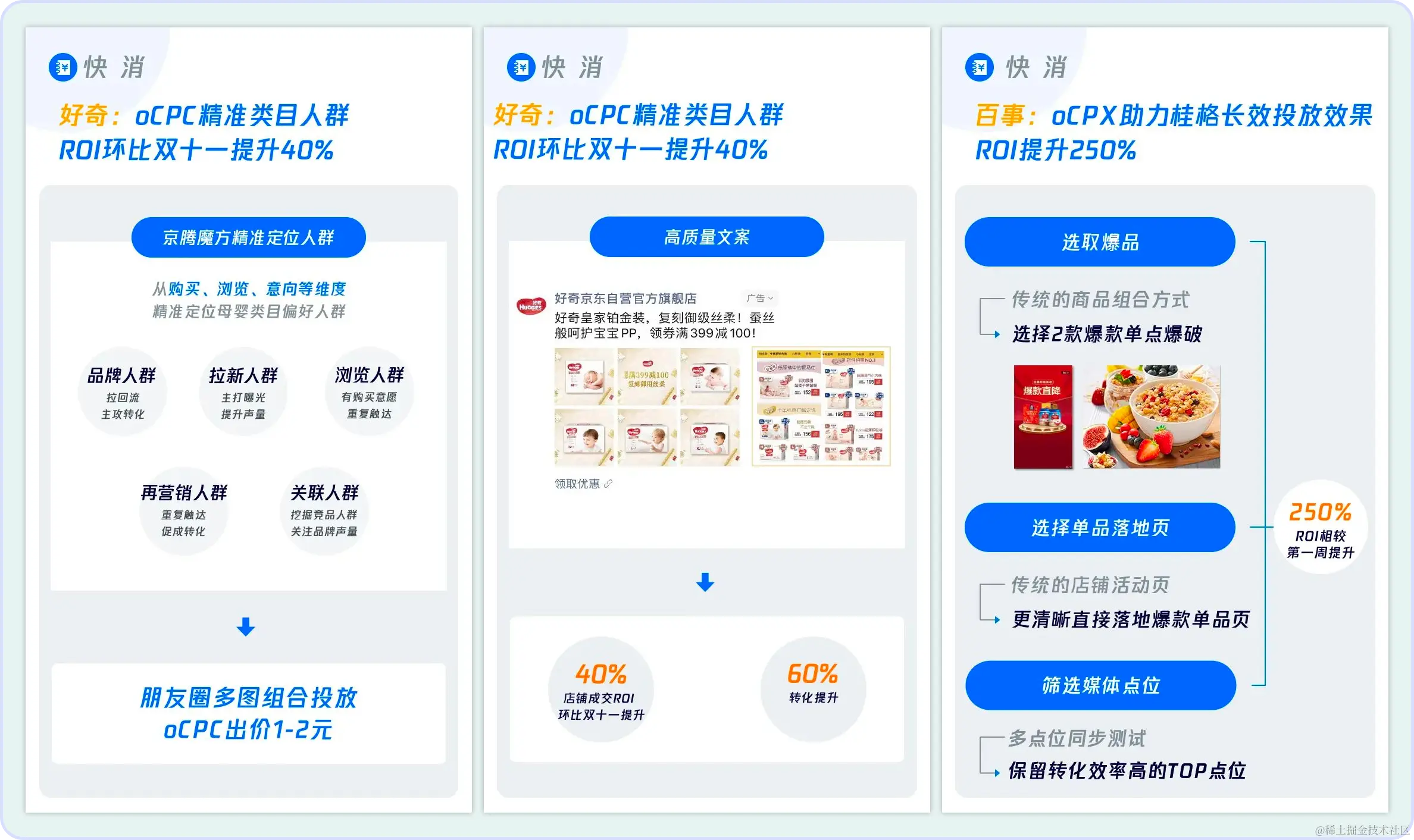 从腾讯广告披露的oCPX实战案例可以看到,针对高频次、低覆盖率以及低转化、高成本的痛点,利用oCPX可以对意向人群进行精准投放,多场景同步推广,并通过创意突出品牌爆款,降低投放成本,助力品牌大促期间获得高ROI。