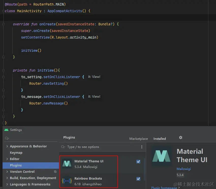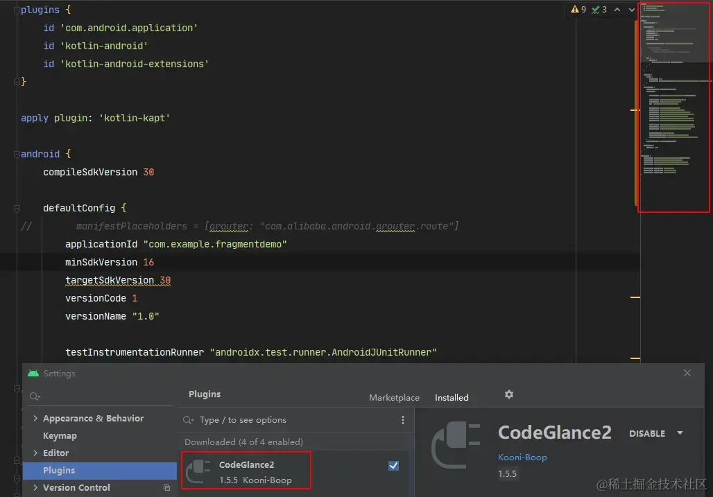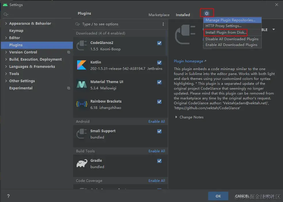 (2) 自行在官方网站中将AS对应版本的插件下载到本地,在Settings/Plugins中点击设置按钮,从本地导入插件;